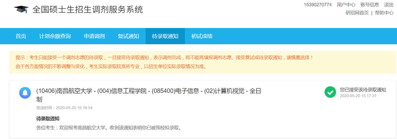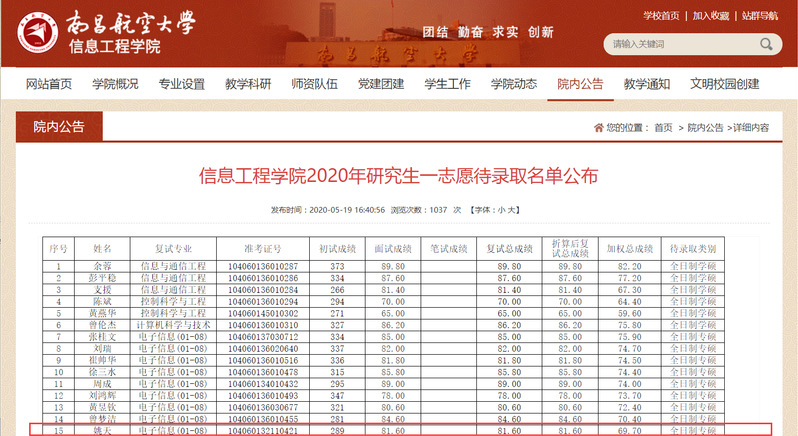 5月19日,南昌航空大学信息工程公司公布了2020年硕士研究生统考招生拟录取名单,公司16级教育技术学专业员工姚天拟被南昌航空大学信息工程公司电子信息专业录取。