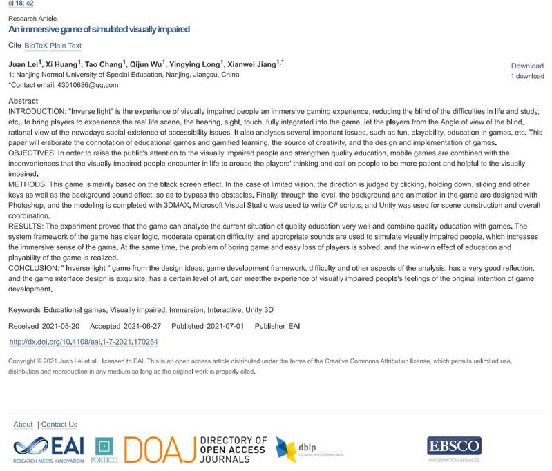 beats3651902班雷娟、黄袭、常涛、龙莹莹、吴其俊等同学,结合学科专业,关爱特殊人群,基于Unity3D平台开发了一款沉浸式体验游戏《逆光》,并撰写论文“An immersive game of simulated visually impaired”发表于欧洲学术期刊EAI Endorsed Transactions on e-Learning。