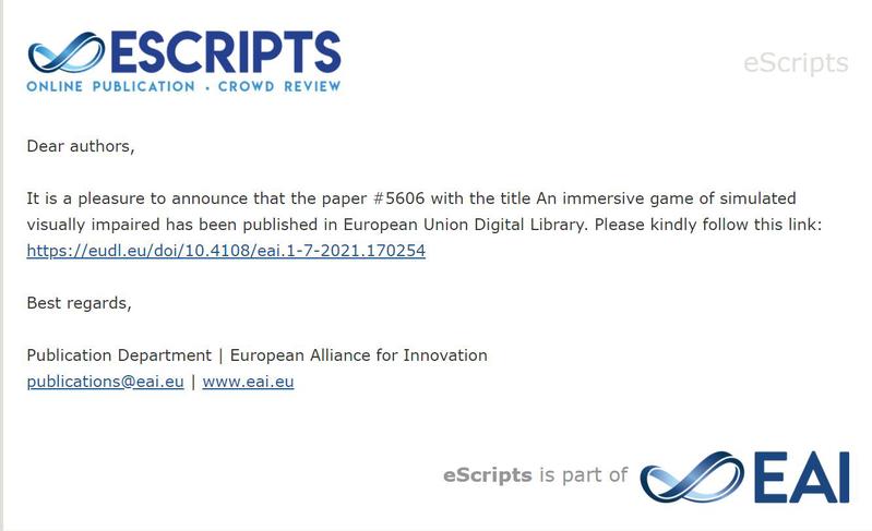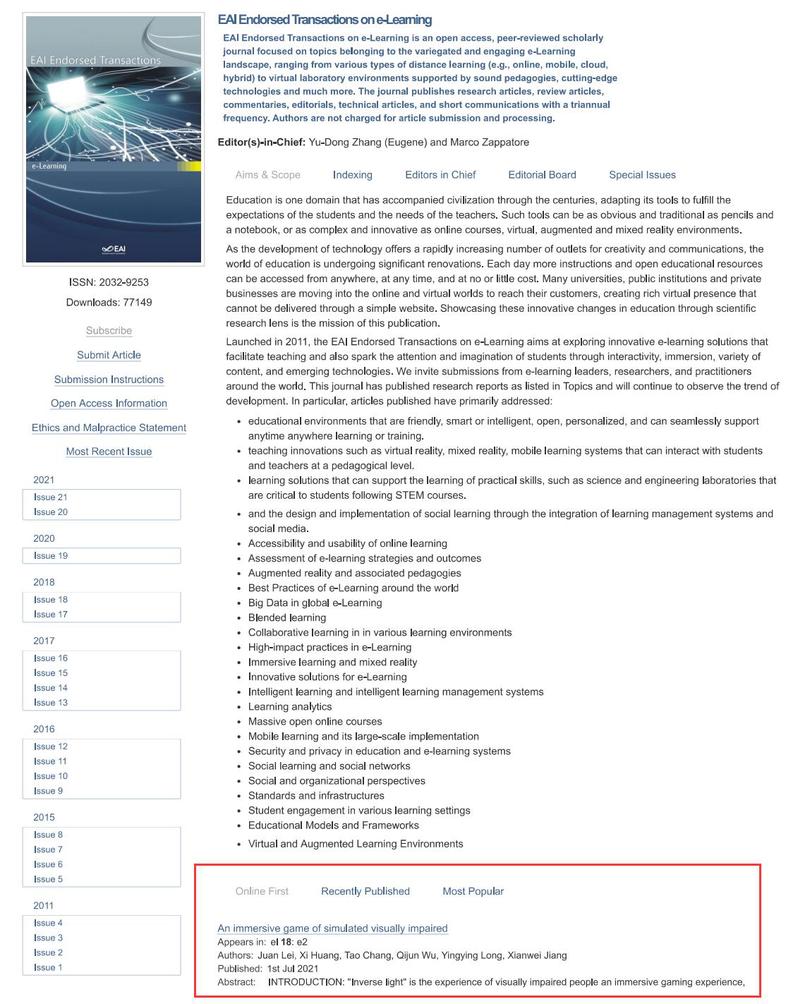 beats3651902班雷娟、黄袭、常涛、龙莹莹、吴其俊等同学,结合学科专业,关爱特殊人群,基于Unity3D平台开发了一款沉浸式体验游戏《逆光》,并撰写论文“An immersive game of simulated visually impaired”发表于欧洲学术期刊EAI Endorsed Transactions on e-Learning。