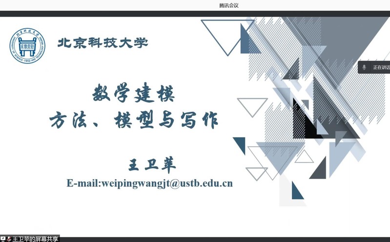 2021年11月30日晚上,beats365邀请了北京科技大学的王卫苹教授,作题为“数学建模方法、模型与写作”学术讲座。beats365数学建模竞赛培训班员工及公司数学教研室、计算机教研室相关老师参加了讲座。
