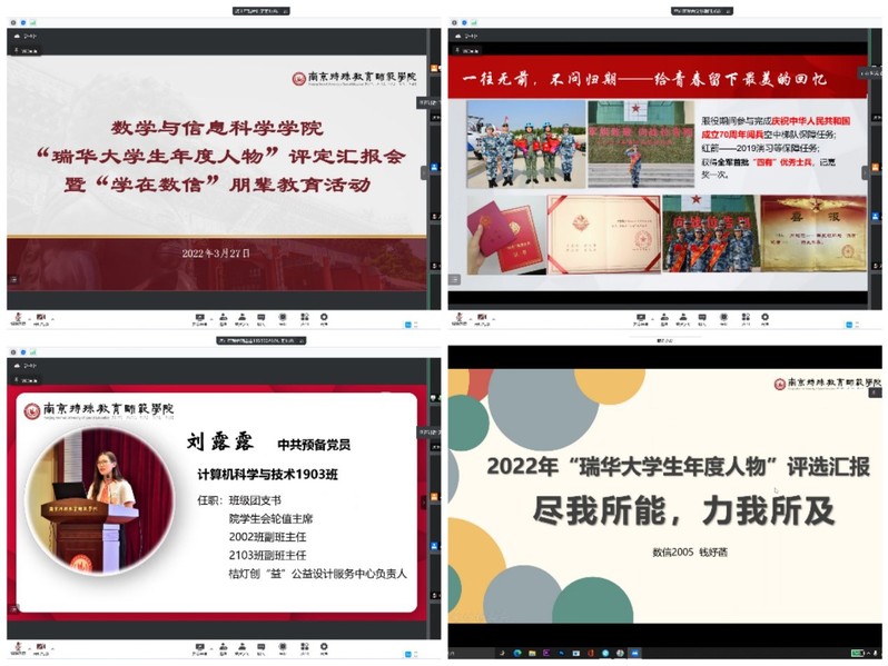 3月27日,beats365线上开展2022年“瑞华老员工年度人物”评审汇报会暨“学在数信”朋辈教育活动,会议由辅导员樊琬老师主持,党总支副书记丁雯、全体辅导员老师和2019、2020、2021级员工代表参加此次会议。