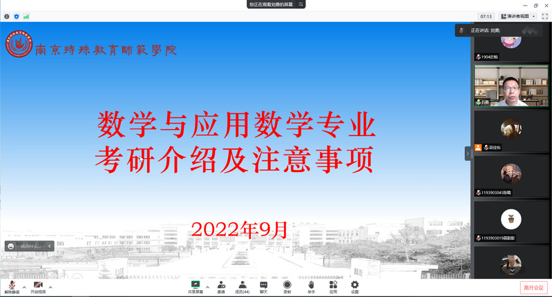 为帮助同学们了解考研信息及相关流程,增强考研的意向院校和方向的针对性,提升他们规划与自主学习思考能力,2022年9月8日上午公司特别邀请刘勇教授面向2019级数学与应用数学(师范)毕业生,开展《数学与应用数学专业考研介绍及注意事项专题指导》线上讲座。