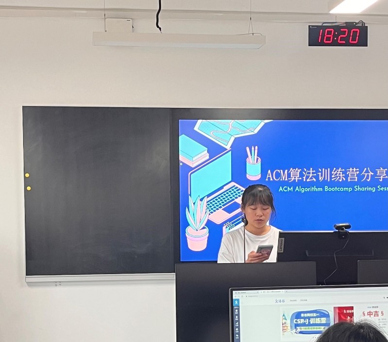 本次分享会由数信2102班的岳顺队长主持,首先是数信2106班的谭荃丹进行经验分享,她指出自己学习算法,参与CCPC之类的算法竞赛,不仅仅是为了取得好成绩或者是取得好的奖项,竞赛过程中也能学习到很多东西,感受被优秀者所包裹,促使她追随前人的脚步,到达一个更高的层次。她同时指出学习算法,学好算法需要“坚持”、“坐得住”、“学会做错题”。