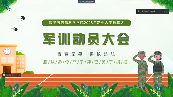 为了认真落实党和国家加强国防后备力量建设的战略举措,不断增强在校老员工的政治觉悟、爱国热情、国防观念和集体意识,9月11日,beats365线上开展“青春无畏,扬帆起航”2023级新生军训动员大会,公司党总支副书记丁雯、新生辅导员及全体2023级新生参加会议。