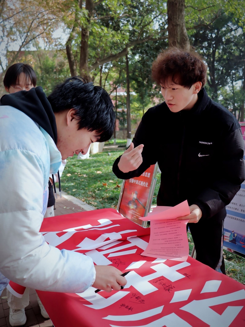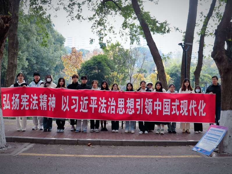宪法我国的根本大法,是治国安邦的总章程,是保持国家统一、民族团结、经济发展、社会进步和长治久安的法律基础,是中国共产党执政兴国、团结带领全国各族人民建设中国特色社会主义的法律保证。通过前期精心的活动策划,活动主要由横幅签名、宪法海报展示、宪法宣传单发放、宪法演讲、宪法集体朗诵等组成。活动一开始现场气氛就非常热烈,从宣传单发放到横幅签名、以及海报展板的展示,都吸引了不少师生驻足了解、积极参与,引起了广泛关注。