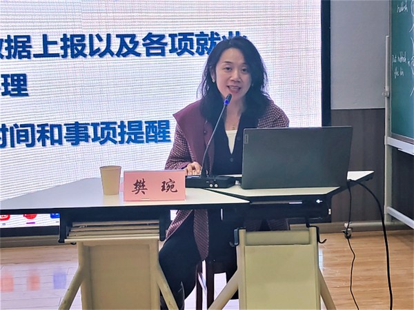 党总支副书记丁雯首先对2023届毕业生就业工作做了简单的总结,通过就业数据的分析,让学们认清当前就业的形势。她强调,同学们要认识到自身的真正需求和定位,积极寻找就业岗位,找到适合自己的择业方向与目标。同时,勉励大家在即将开启人生新阶段中要克服消极焦虑和胆怯盲目,认清就业形势,转变观念思路,把握机遇机会;鼓励毕业生积极配合、跟紧节奏,早谋划、早安排、早着手、早行动,重视就业选择,顺利走向人生新阶段。