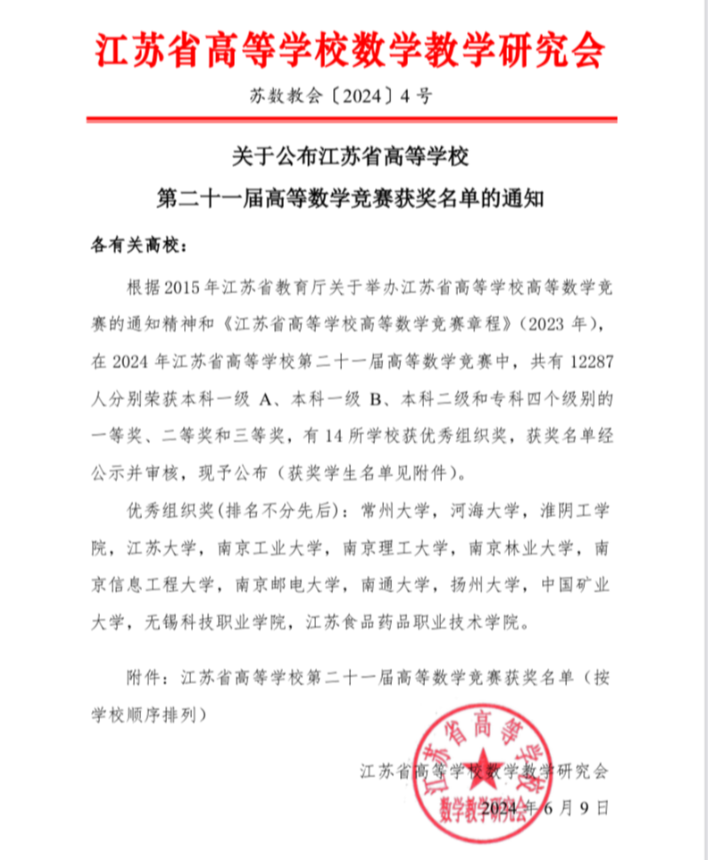 近日,江苏省高等公司第二十一届高等数学竞赛在全省各大高校隆重举行。公司beats365数学系老师们辛勤付出、精心指导,带领员工们勇攀高峰,最终斩获了3个一等奖、11个二等奖和14个三等奖的辉煌成绩,创下了公司近五年来在该竞赛中的最佳纪录。