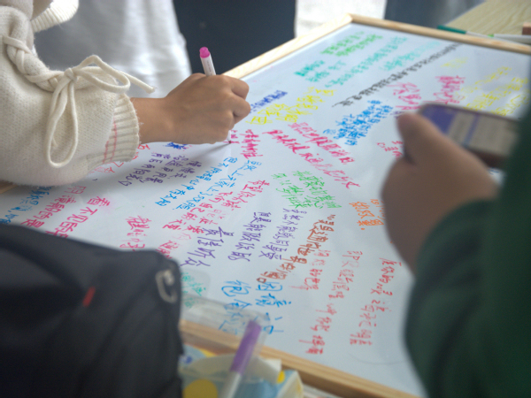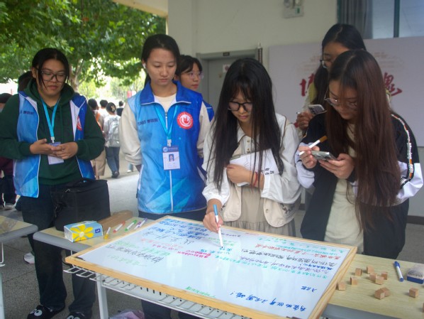尽管活动当天细雨绵绵,但并未影响同学们的参与热情。本次活动包括签字祝福和摸字块猜字两项内容。活动现场,大家纷纷拿起笔,在巨大的签字板上写下对视障群体的美好祝愿和鼓励话语,一笔一划承载着对视障朋友的关心和支持。在摸字块猜字环节,同学们戴上眼罩,通过触摸凸起的盲文来猜测对应的词语,游戏旨在让参与者亲身体验视障人士在获取信息时的不易,从而更加深刻地理解他们在日常生活中面临的诸多挑战。