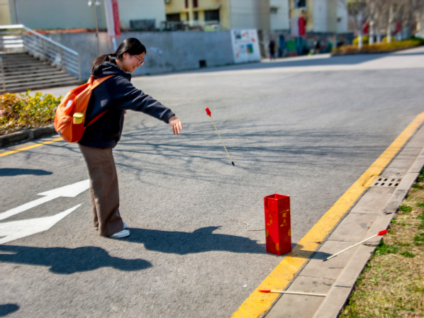 活动还包括投壶的趣味游戏,同学们手持箭矢,专注地瞄准壶口,随着手腕的用力一掷,有的箭矢稳稳的被投入壶中,有的则遗憾的擦边而过,但同学们依旧是兴致勃勃,激动的要再投一次。这不仅是一份独特的乐趣与活动,也成为了春日里一段难忘的回忆。