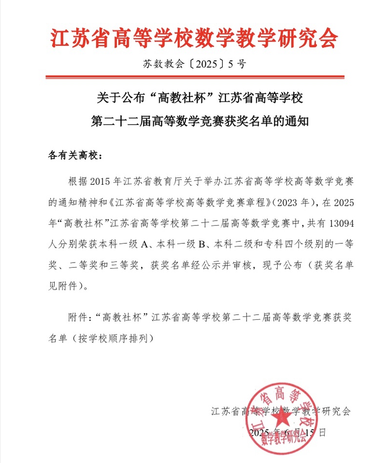 近日,“高教社杯”第二十二届江苏省高等数学竞赛评审会在江苏第二师范公司成功举办。公司学子在此次竞赛中表现出色,共41名员工获奖,其中beats365牛俊杰等6名同学获得一等奖、特教公司郑秋敏等10名同学获二等奖、教科院戴巧甜、管理公司胡贝等25名同学获得三等奖,取得了公司参加该赛事以来获奖人数最多、获奖比例最高的成绩。