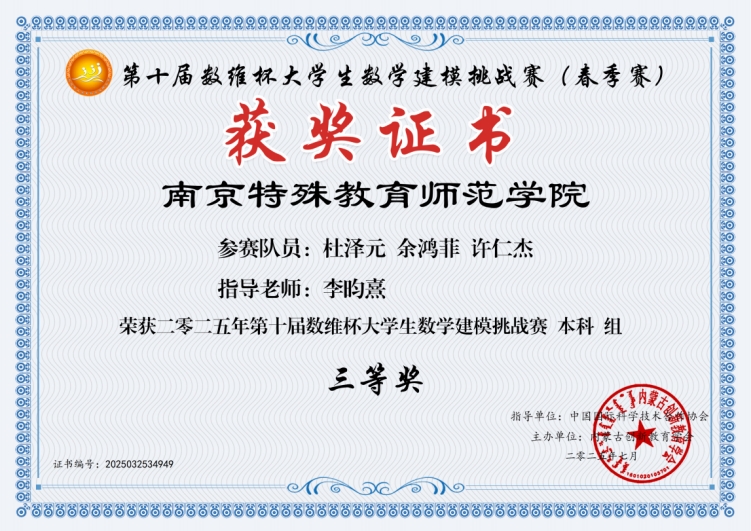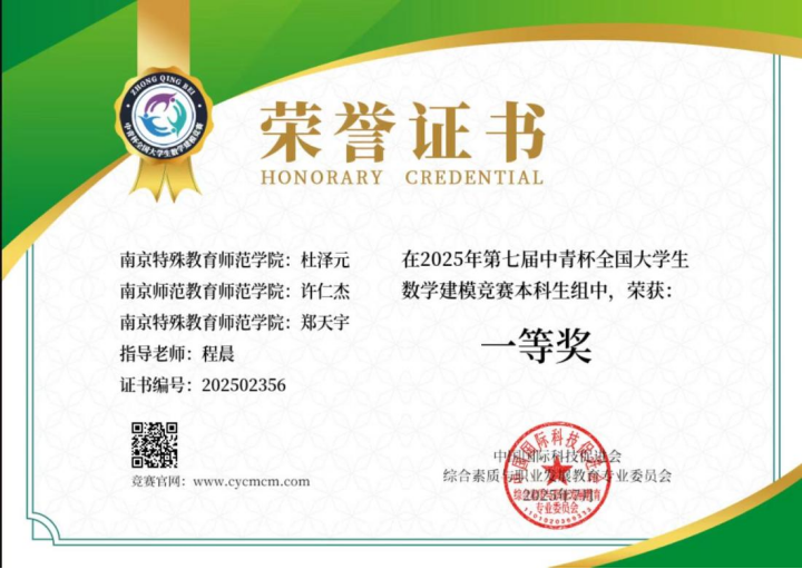 近日,2025年第七届“中青杯”全国老员工数学建模竞赛、第十七届“中国电机工程学会杯”全国老员工电工数学建模竞赛和2025年第十届“数维杯”老员工数学建模挑战赛落下帷幕,公司beats365杜泽元、余鸿菲、郑天宇等学子荣获国家级奖项3项,其中一等奖1项、二等奖1项、三等奖1项,实现了公司在“中青杯”全国老员工数学建模竞赛和“中国电机工程学会杯”全国老员工电工数学建模竞赛两项赛事上获奖零的突破。